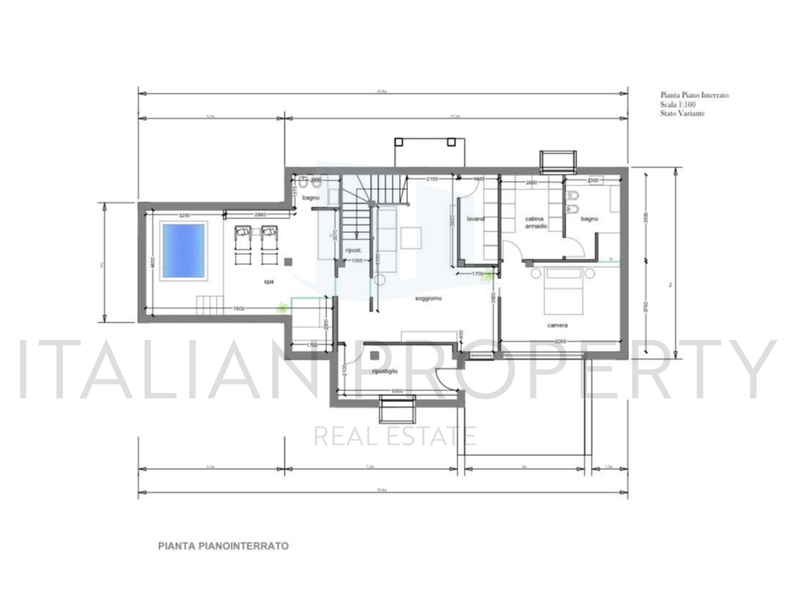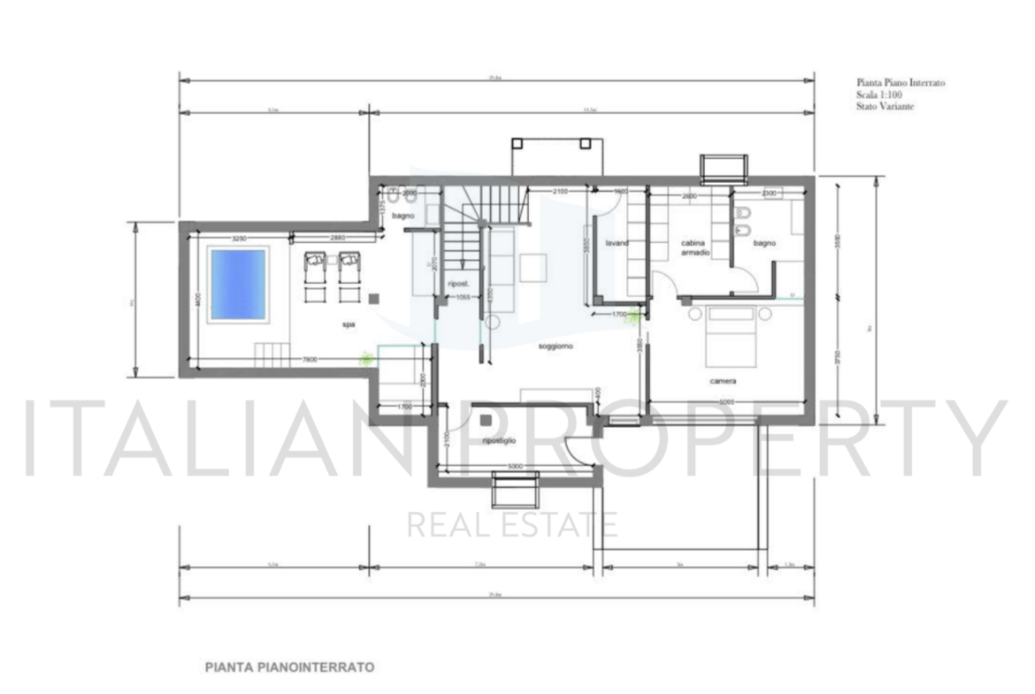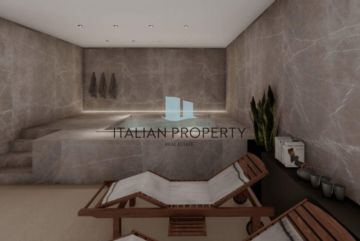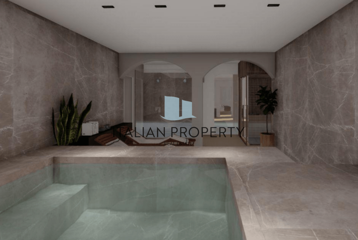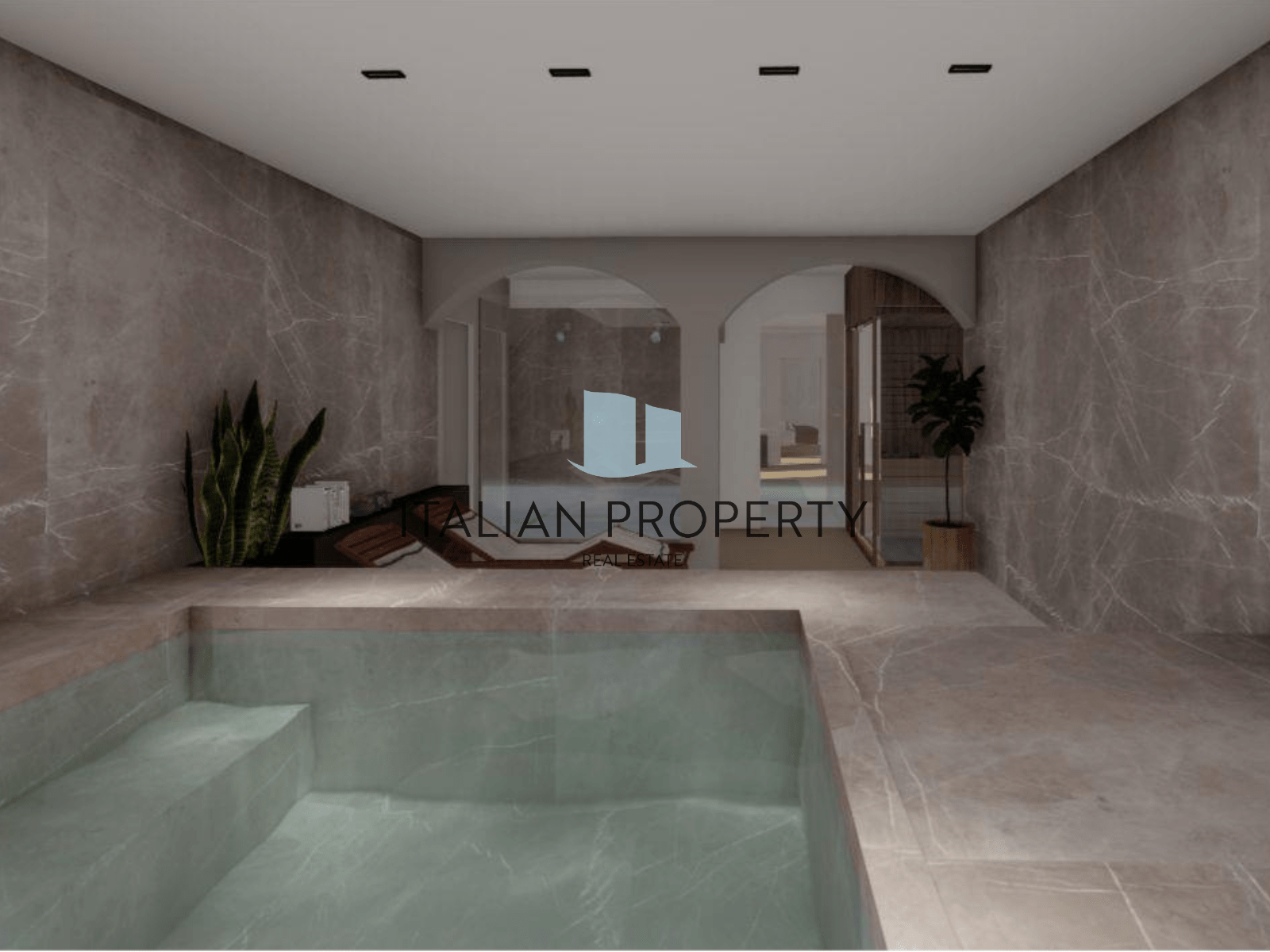 Die Villa befindet sich auf der Semi-Interrato-Etage. Wir finden den unabhängigen Zugang, ein großes Wohnzimmer, ein großes Schlafzimmer mit begehbarem Kleiderschrank, den Spa-Bereich mit beheiztem Innenpool, 2 Badezimmer (eines im Zimmer), die Waschküche und den Abstellraum.
