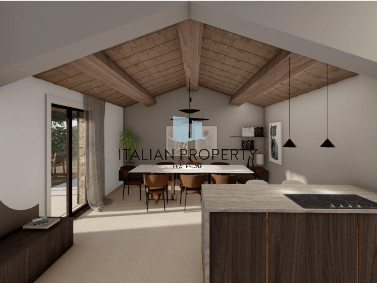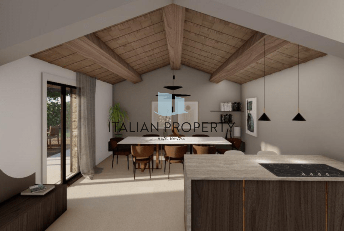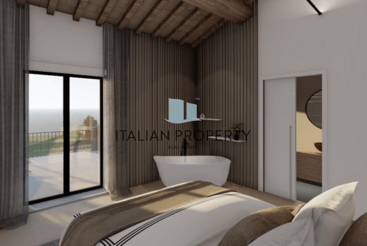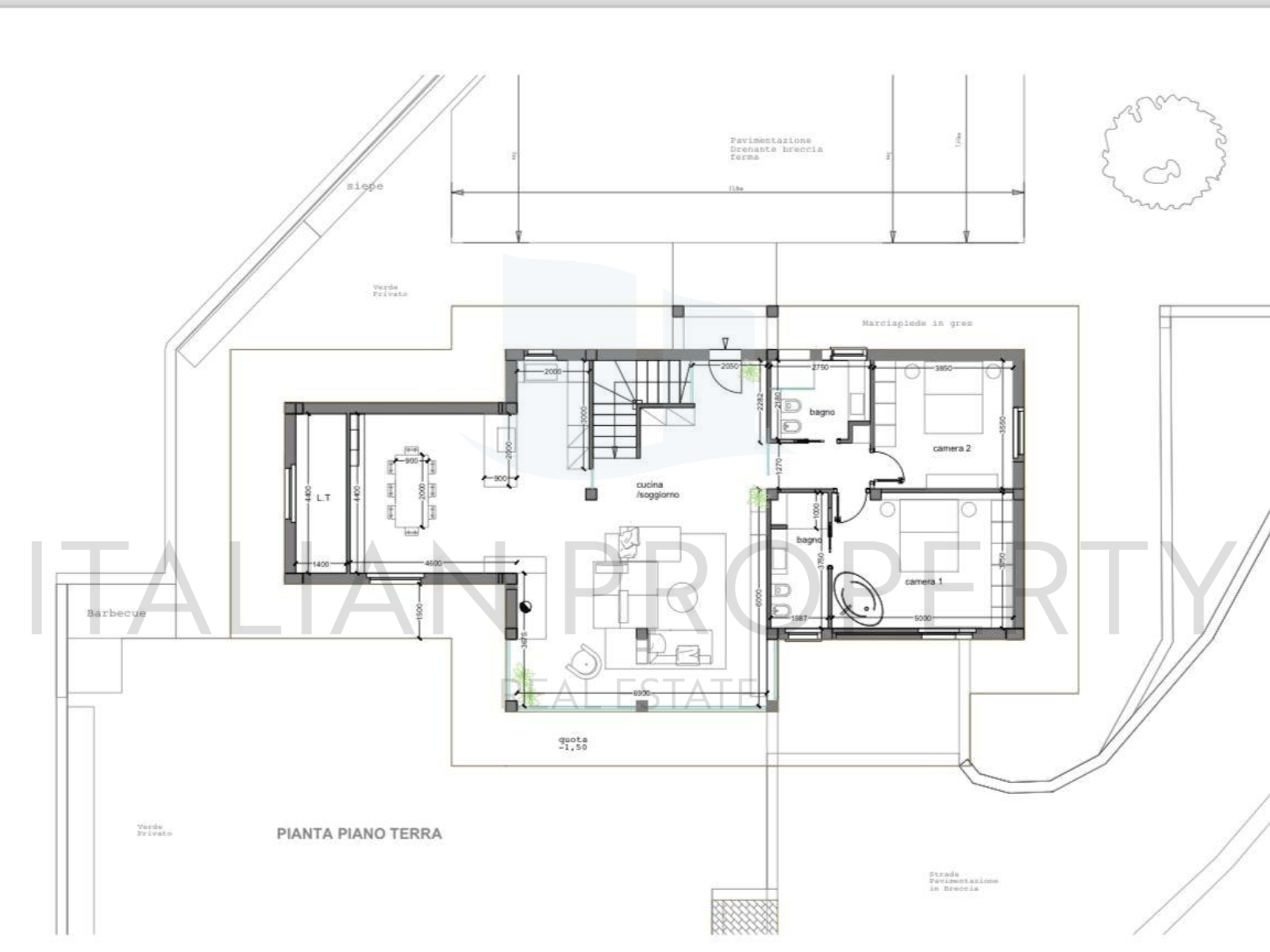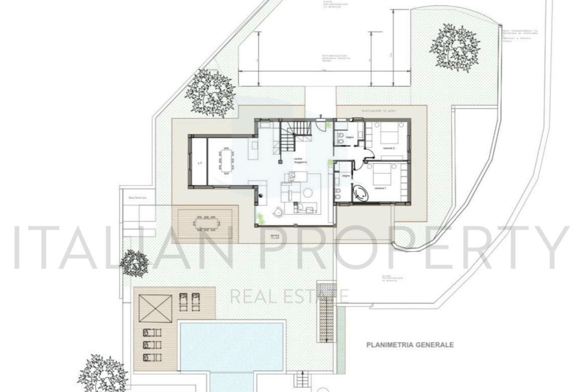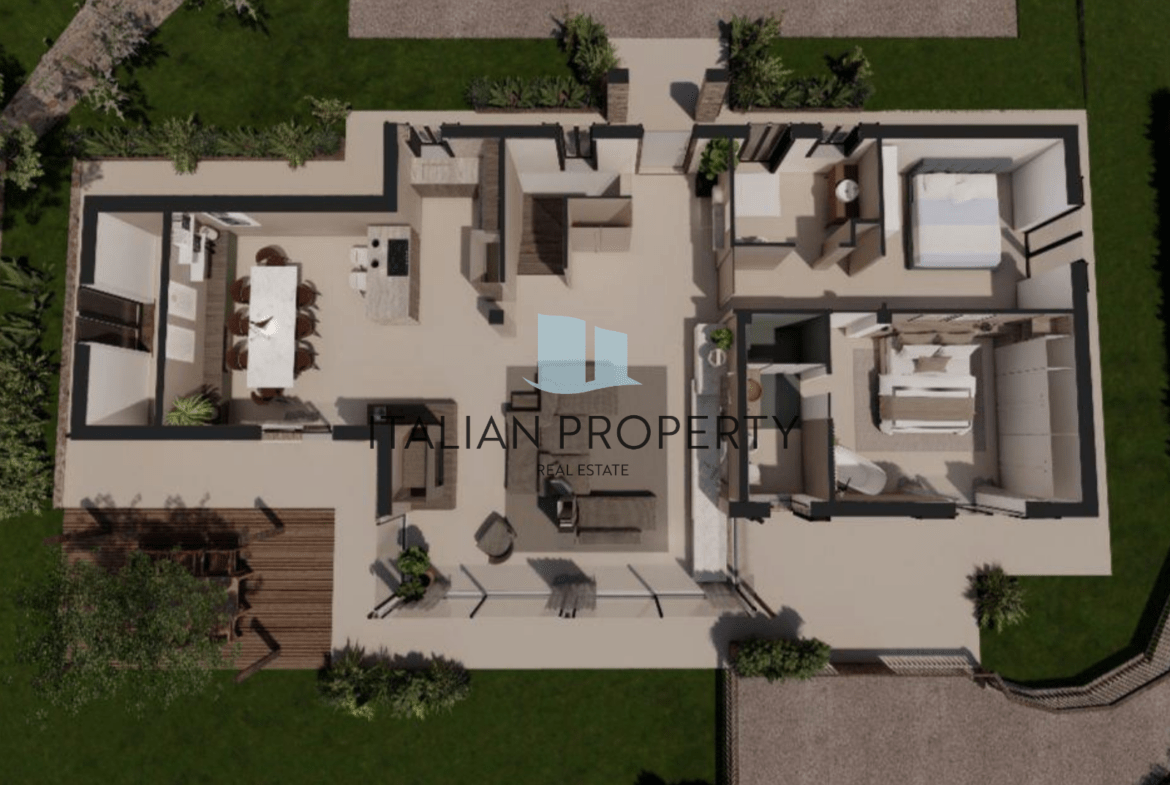 Die Villa befindet sich auf der Semi-Interrato-Etage. Wir finden den unabhängigen Zugang, ein großes Wohnzimmer, ein großes Schlafzimmer mit begehbarem Kleiderschrank, den Spa-Bereich mit beheiztem Innenpool, 2 Badezimmer (eines im Zimmer), die Waschküche und den Abstellraum.