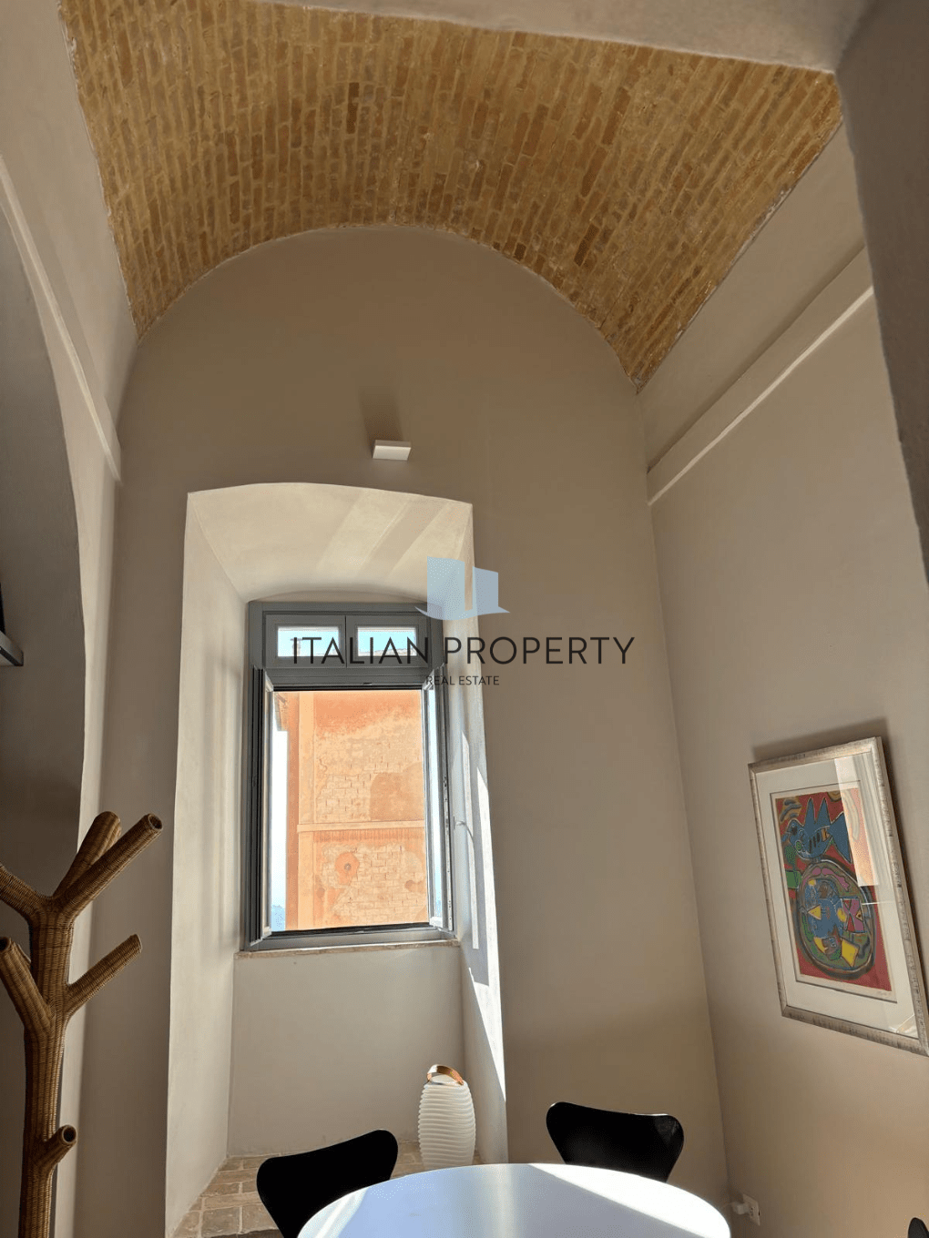 In the historic center of Perugia, in an ancient palace of 1632 overlooking Assisi and some historical buildings, after crossing a wonderful cloister, you access this beautiful apartment, part of the cloister is for exclusive use of the apartment. The recently renovated building has been restored to its former glory, so also the apartment, inside we find a mix of old and modern, the furniture is of high value and economic value and are included in the sale price. The apartment is on one floor of about 90 square meters, but the construction of 2 mezzanines has expanded its size, the windows are made of wood and glass with mosquito nets, lighting fixtures are by Flos, kitchen custom-made with AEG appliances, Fritz Hansen, Poliform, Zanotta, Vitra, Gervasoni and Minotti. A few minutes walk you can reach both the panoramic gardens and the most important historical sites of Perugia.