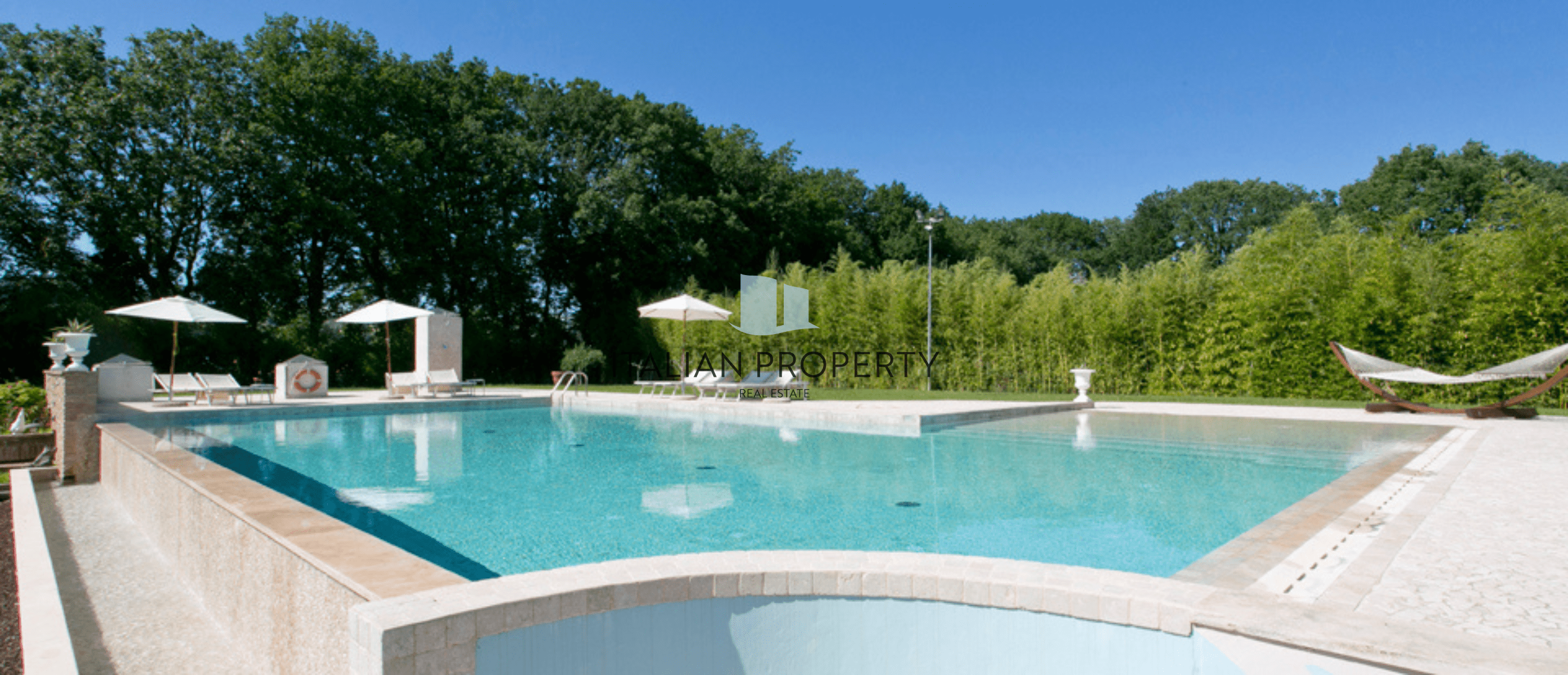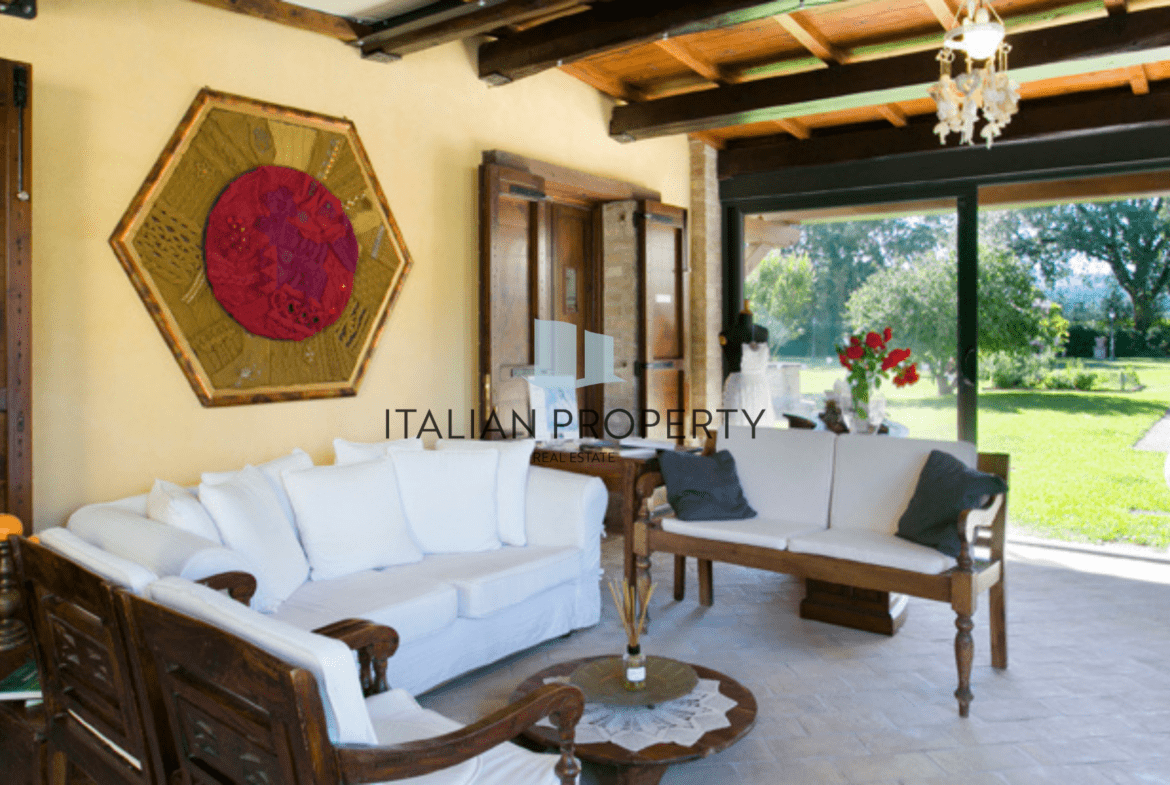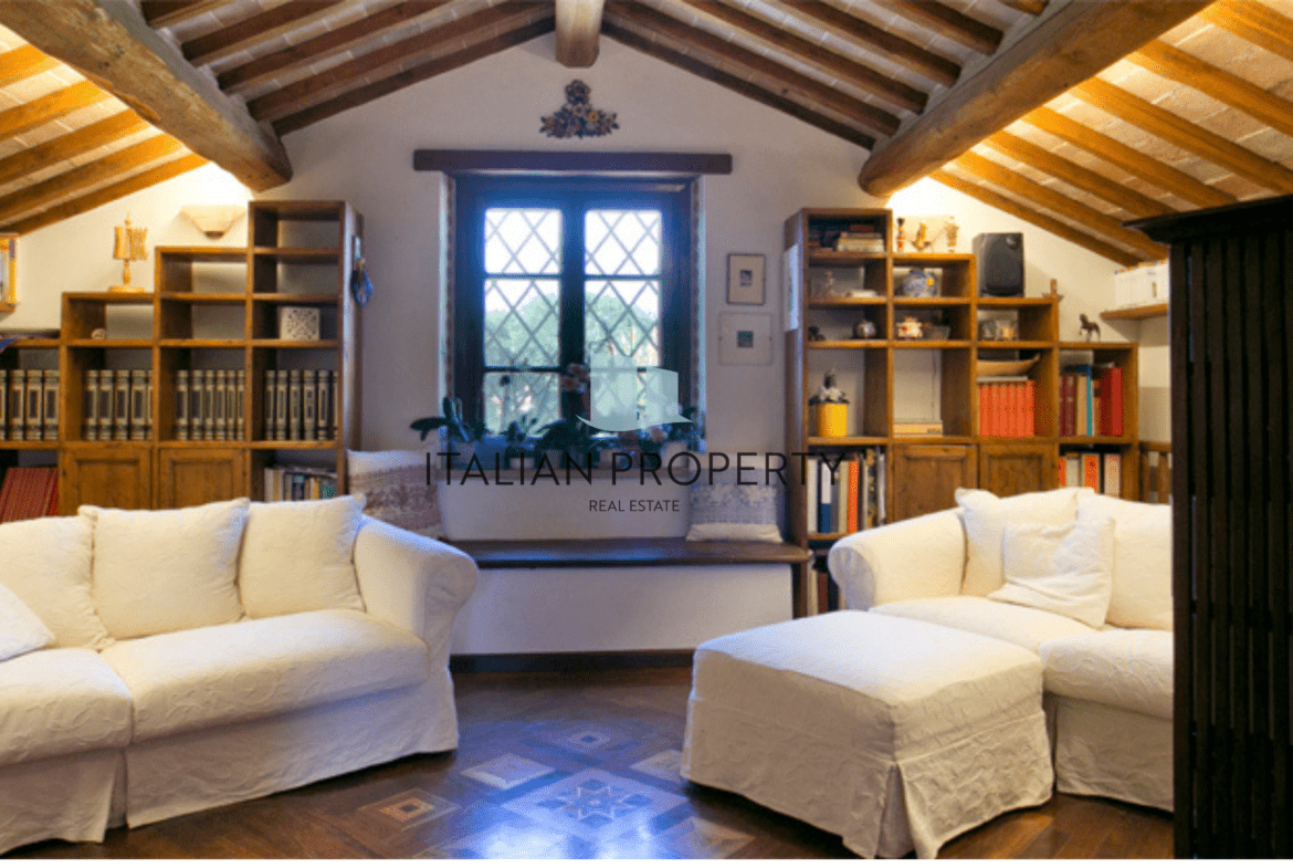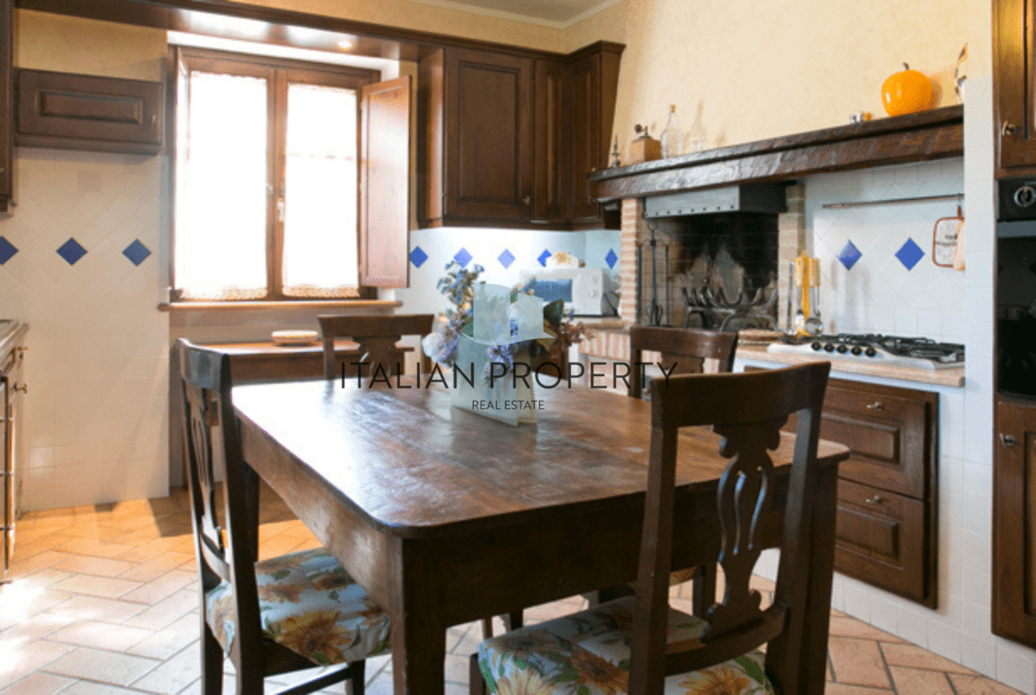 Il compendio immobiliare è stato ristrutturato con finiture di alto livello, è costituito da un corpo centrale (o casa principale)di 572 mq con una torre, dove al piano terra troviamo un grande portico con accesso ad un primo soggiorno con ampie vetrate che permettono l’uscita sul giardino, una cucina, un secondo e grande soggiorno rialzato con un magnifico camino, un piccolo disimpegno, 1 bagno, un forno per la cottura del pane ed i locali tecnici e nel piano ribassato si trova una bellissima cantina; al primo piano troviamo 2 cucine, una zona pranzo, un soggiorno con camino con accesso ad una meravigliosa terrazza coperta che affaccia sul giardino, oltre a 3 bagni, 4 camere, 1 disimpegno, 1 ripostiglio e la zona con soppalco della Torre. La dépendance è collegata alla casa principale, tramite una veranda con ampie vetrate apribili con vista sul giardino, dove inoltre ci sono ulteriori 3 wc, un antibagno, un disimpegno e un magazzino per totali 74 mq; la dépendance di mq. 66 con accesso privato, è composta da una cucina, un soggiorno/pranzo, 1 ripostiglio, 2 disimpegni (zona notte), 2 camere e 2 bagni. Il compendio comprende una casa “ospiti” con 2 appartamenti separati, il primo al piano terra di mq 165 con un portico, è composto da una cucina abitabile con un soggiorno/pranzo, un secondo grande soggiorno, un disimpegno (zona notte), 3 camere, 3 bagni. Il secondo appartamento di 90 mq al quale si accede da una bellissima scala in pietra e mattoni con un piccolo porticato, è composto da una grande cucina abitabile, un soggiorno con camino, un disimpegno (zona notte), 2 camere e 2 bagni. La proprietà comprende un bellissimo parco di 2 ettari che circonda le case, una meravigliosa piscina 8×16 e una zona con impianto fotovoltaico capace di fornire 12 kw di corrente.