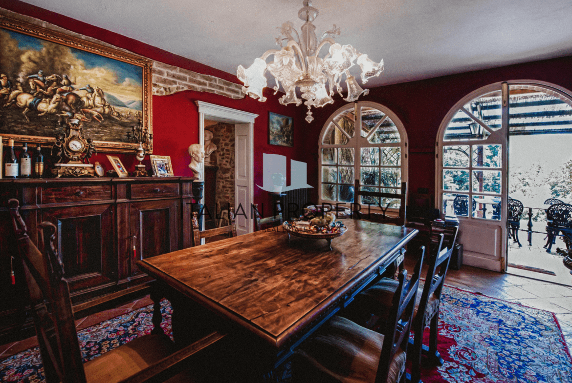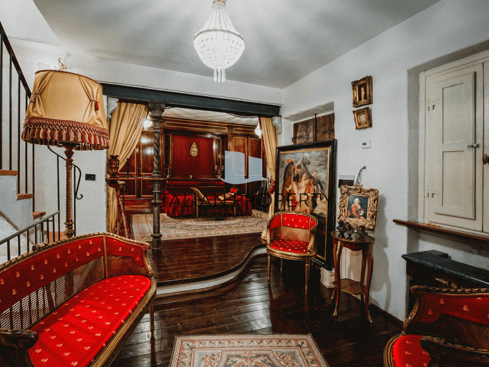 Internamente al piano terra la pavimentazione è in cotto fatto a mano, i lampadari provengono dal nobile artigianato di Murano, al piano superiore troviamo a terra dei bellissimi listoni di Larice lavorato a mano, Travertino di prima scelta nei bagni insieme ai mosaici Bisazza e accessori disegnati da Philippe Starck, mobili ed arredi sono in Mogano di prima qualità realizzati su misura da abili artigiani, pregiati tessuti fiorentini per i divani di uno dei soggiorni, mentre nell’altro troviamo magnifici divani Chesterfield di Poltrona Frau ed uno splendido camino di design.